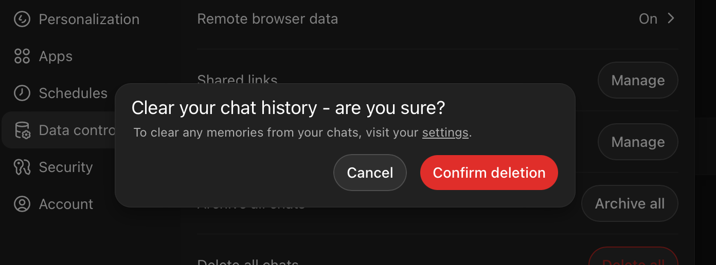 There is also a more radical option: deleting chats, or deleting all chats. That removes them from the interface and reduces what remains available for continuity across threads.