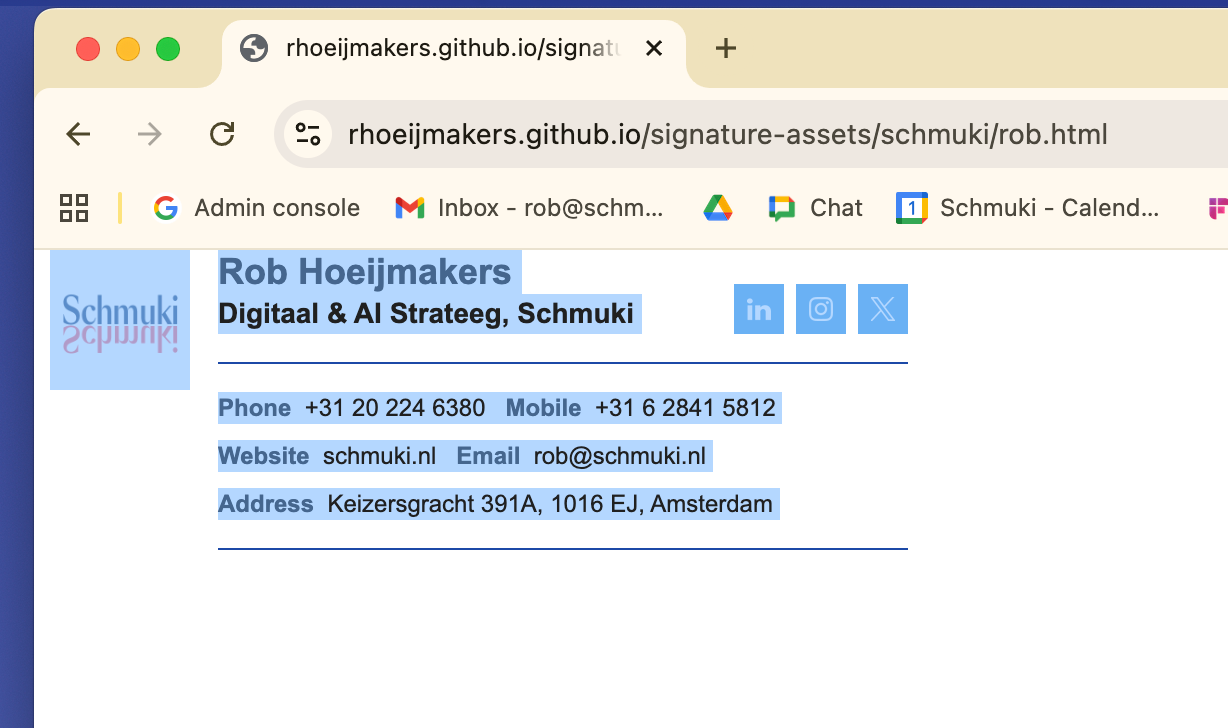 Then came the funny part. My workflow involves both Safari and Chrome. I built the signature, tested it, copied it from the browser into Mail and it looked perfect. A small miracle. Later, without thinking, I opened the same HTML file in Safari, copied again, pasted again… and suddenly everything was broken. Images gone, layout distorted, back to square one.