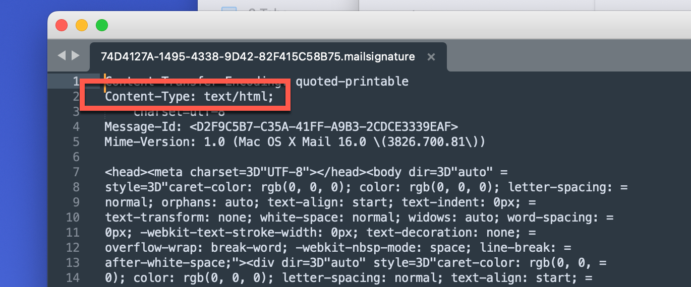 Apple Mail’s internal logic comes from another time. For a long period it didn’t really speak HTML, the language of the web. It spoke RTF, Rich Text Format, a relic from the pre-web desktop era. It looked like HTML, but it wasn’t. Under the hood, Mail stored your signature as a .mailSignature file, full of strange formatting codes that belonged to WordPad, not the web.