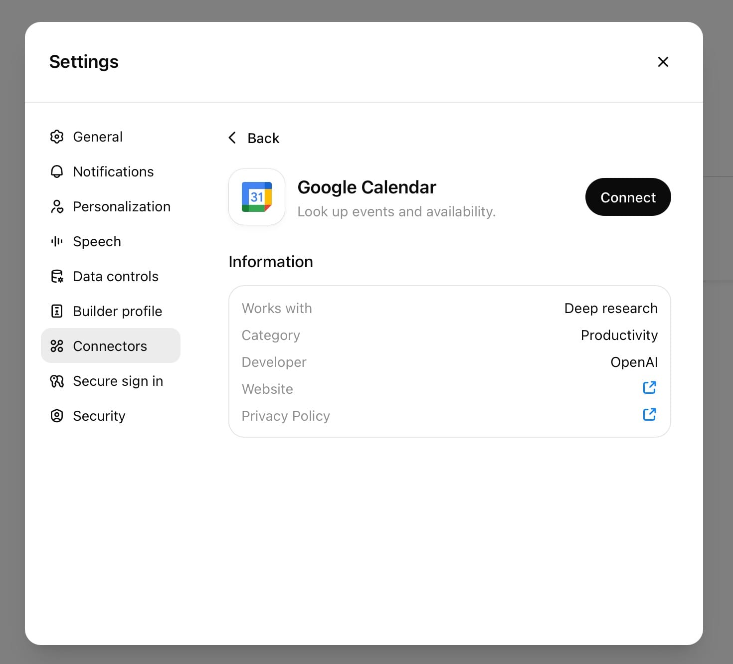 Connectors act as live data bridges between ChatGPT and third-party sources. If you’re used to tools like NotebookLM, or if you’ve worked with custom RAG (retrieval-augmented generation) setups via APIs or plugins, this feels like a native, out-of-the-box version of that concept—MCP-like pipelines for mainstream users.
