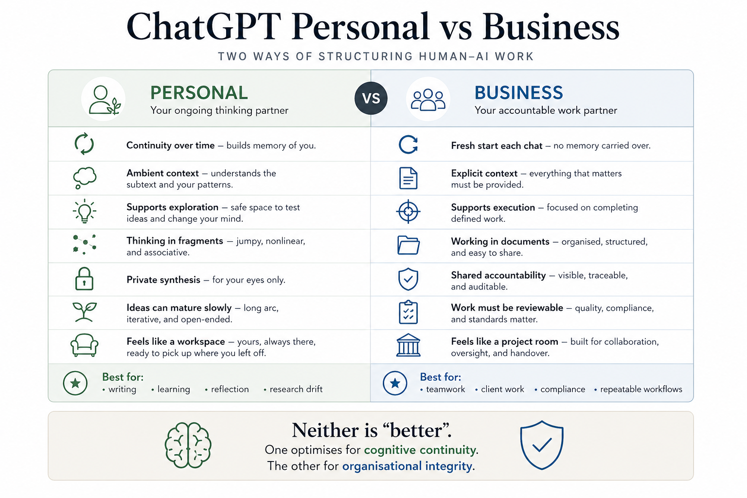 In practice, using ChatGPT in a personal context feels fundamentally different from using it in a business context. Not because one is more powerful than the other, but because each configuration embodies a different assumption about continuity, memory, and responsibility.
