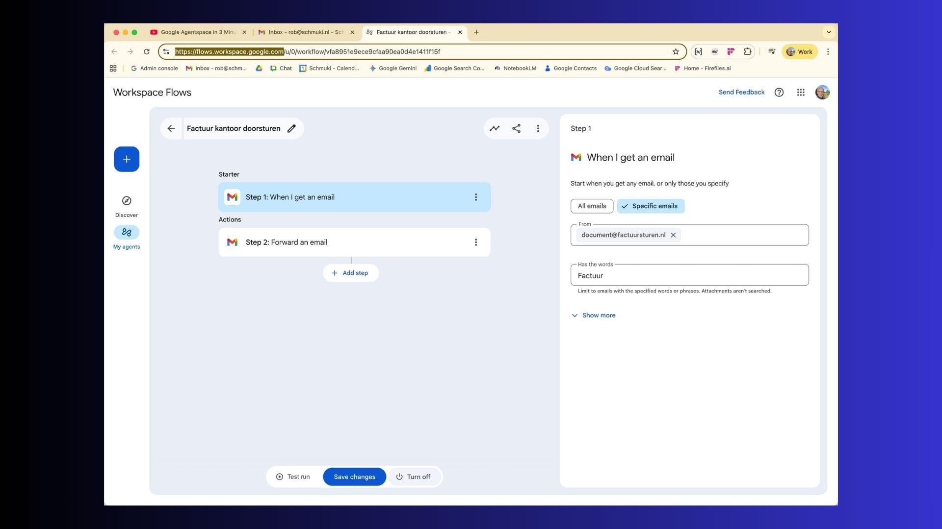 You start with a trigger — “when a message arrives from…” — and add actions: move it, reply, store an attachment, post to Chat.