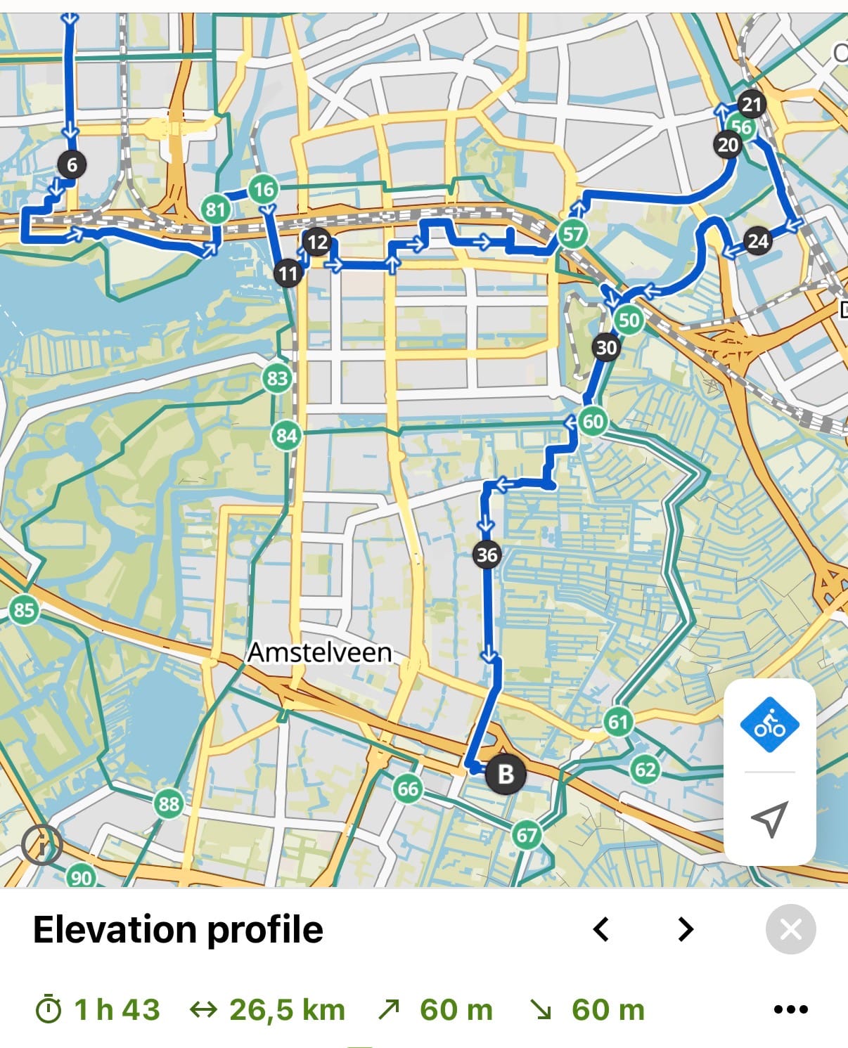 Komoot kept me on track while riding, turning the experiment into a tangible experience. What started as a playful idea with AI-generated data became an actual cycling route through Amsterdam’s corporate landscape.