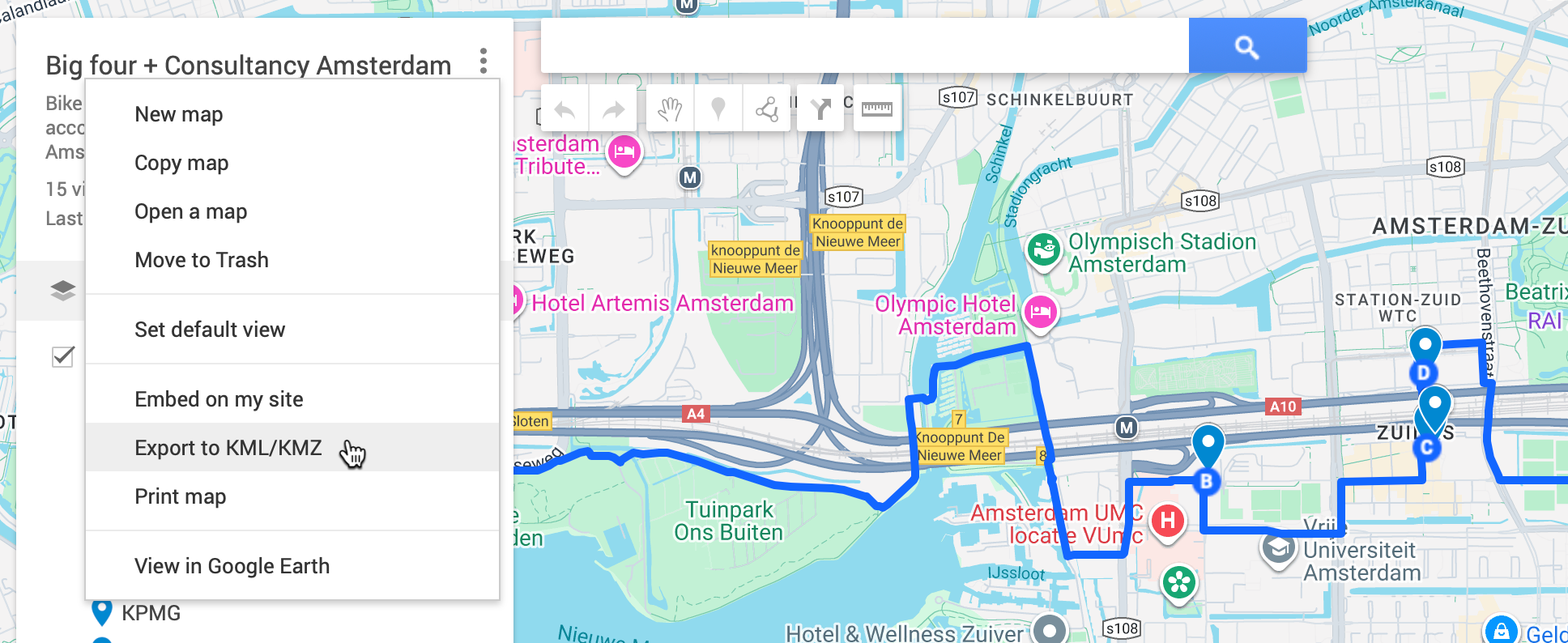 As an experiment, I asked ChatGPT to generate a KML file with the major consultancy and accountancy firms in Amsterdam. I loaded it into Google Maps, connected the dots, and created a route that linked them all.
