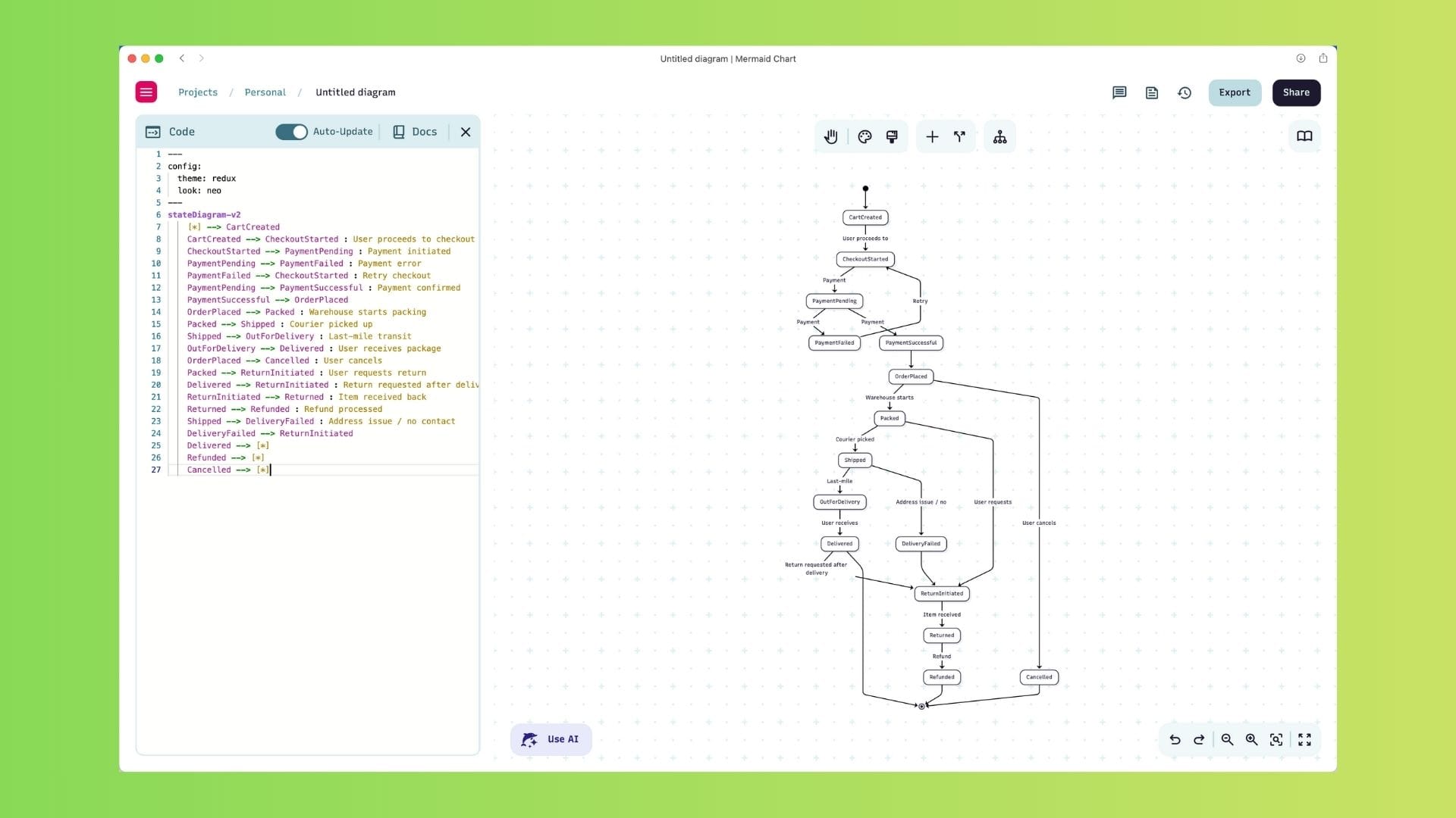 When paired with a large language model, whether ChatGPT or the AI module in MermaidChart, the step from natural language to exact structure becomes almost seamless. What once demanded technical fluency now feels like a conversational act, bringing precision within reach of anyone working with ideas.