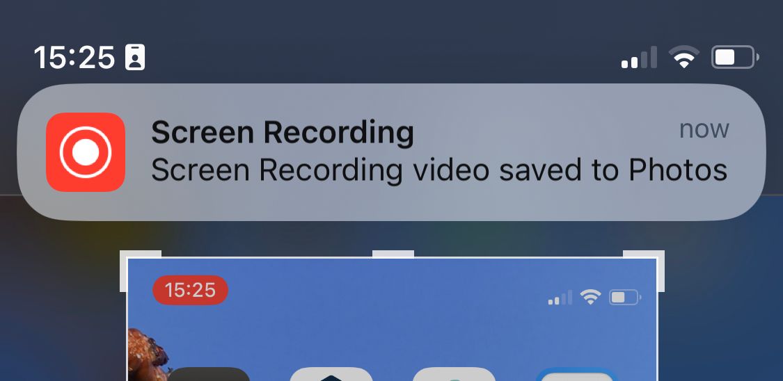 Now that it is on in the Control Centre, you can make a recording. Open the Control Centre by swiping down in the right-hand corner of the screen. In the Control Centre there now is an icon for recording and when you press it, a countdown starts. Close the Control Centre and record what you wanted to record.