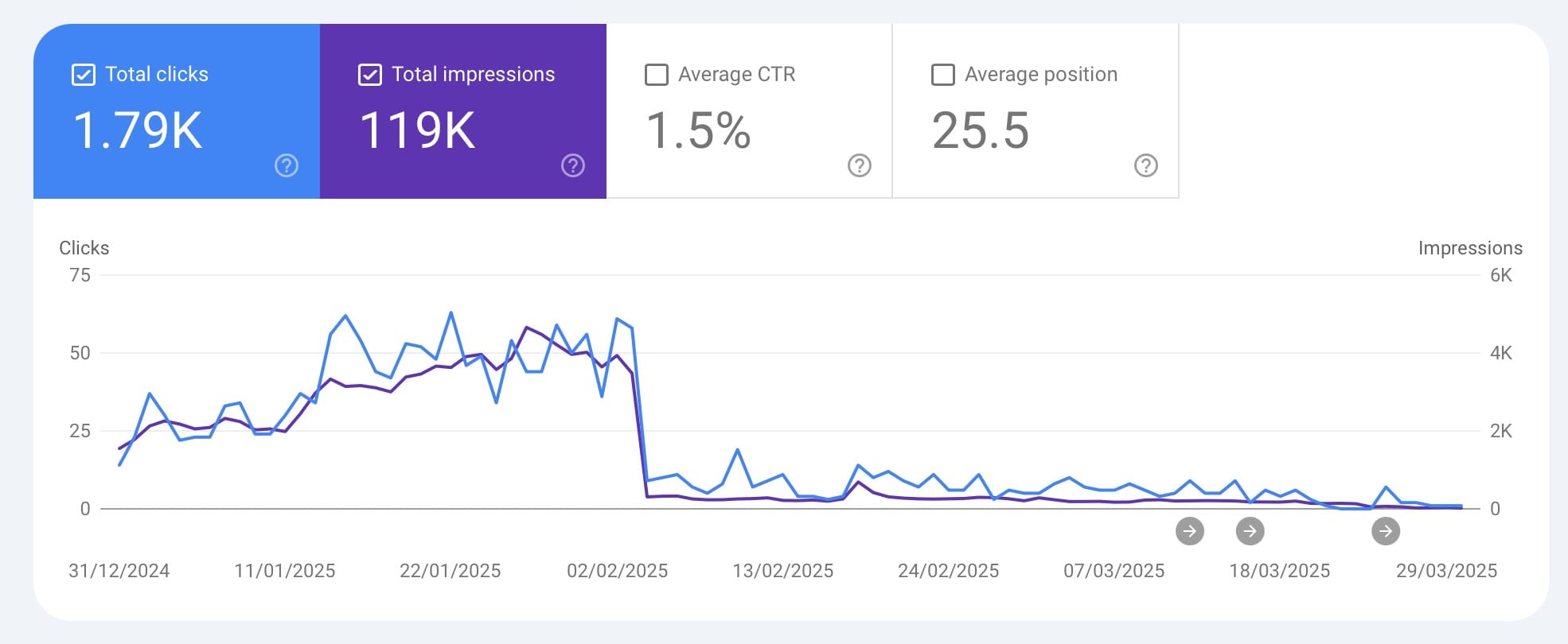 No warnings, no manual actions—just silence. At first I thought it was a technical error, maybe something related to the domain move I did in December. But the deeper I looked, the clearer the picture became.