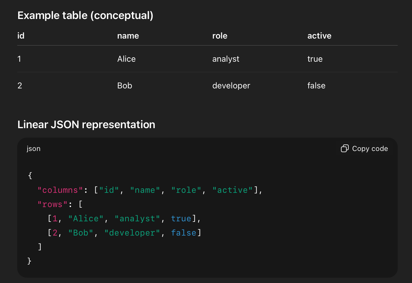 They read linearly. When they encounter tables, they do not perceive a surface. They process sequences. JSON, YAML, CSV are not spatial to them. They are linear encodings of structure.