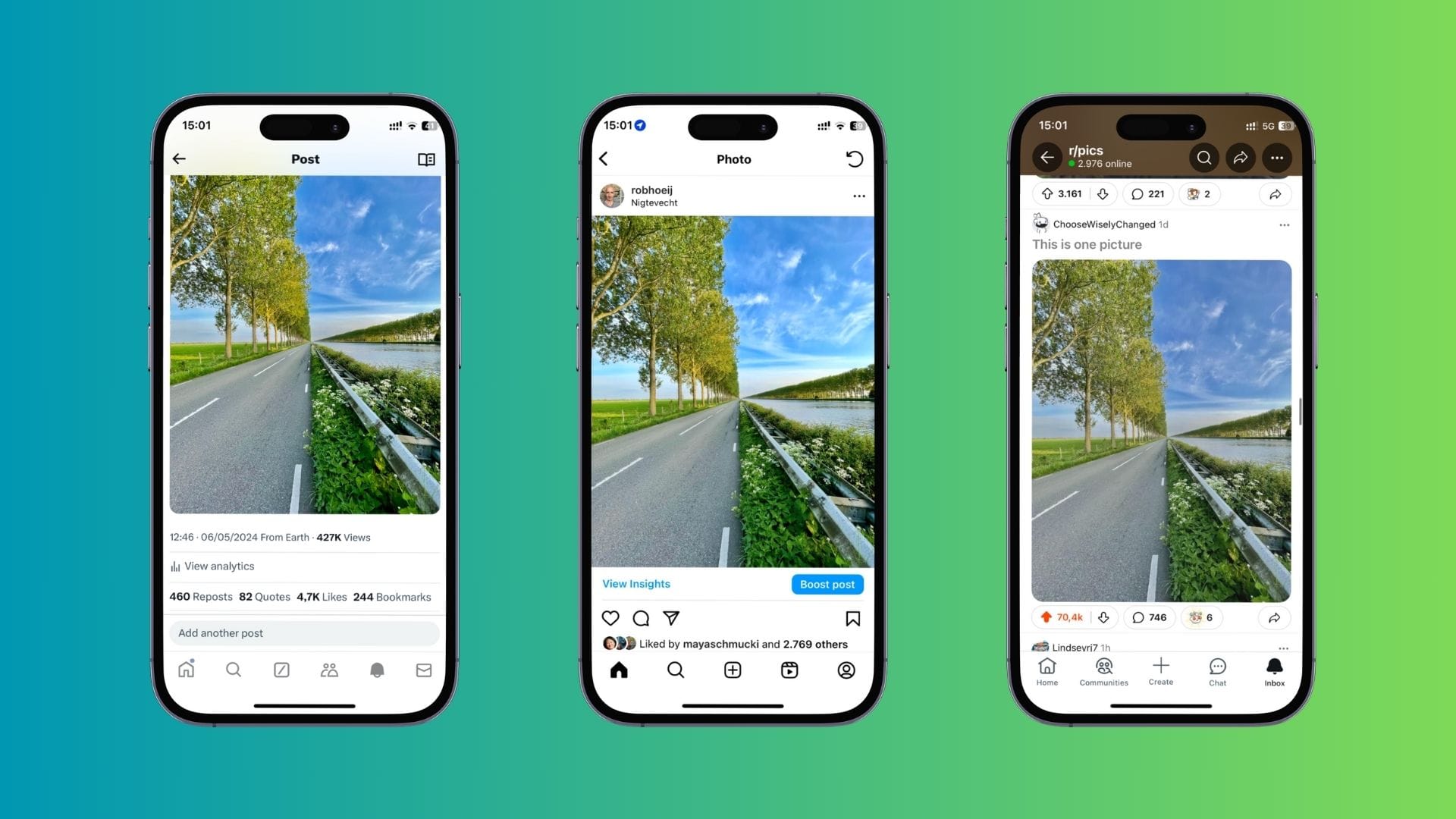 Excited by the result, I shared the photograph across multiple social media platforms. On X and Instagram, I tailored my posts: a pointy text in Dutch for X and a focus on the image for Instagram. I also shared it on Facebook, mainly for my friends, and, unusually, on LinkedIn.