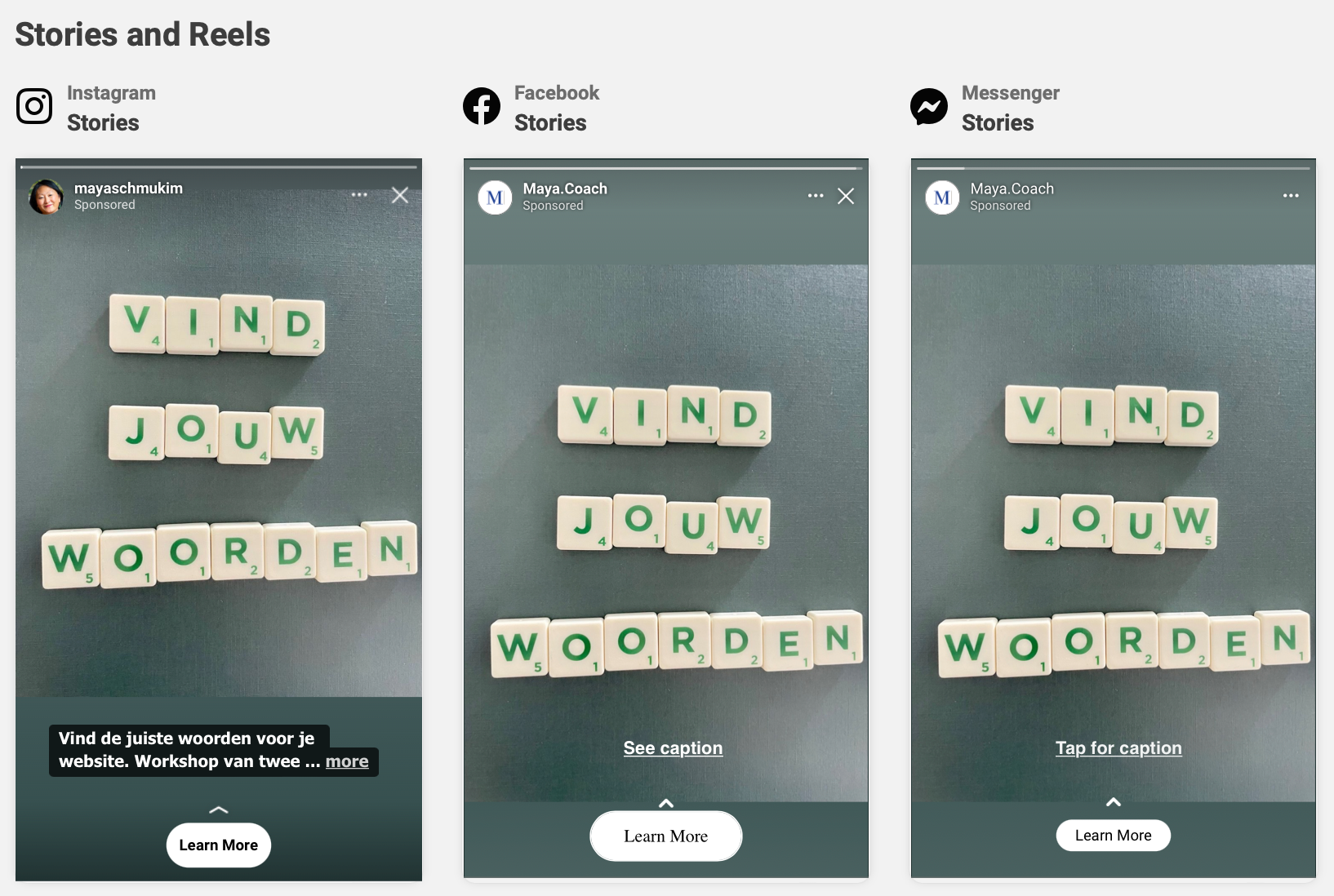 The campaign is running on Facebook and Instagram, in the news feed and stories. The images there are generally standing or square: